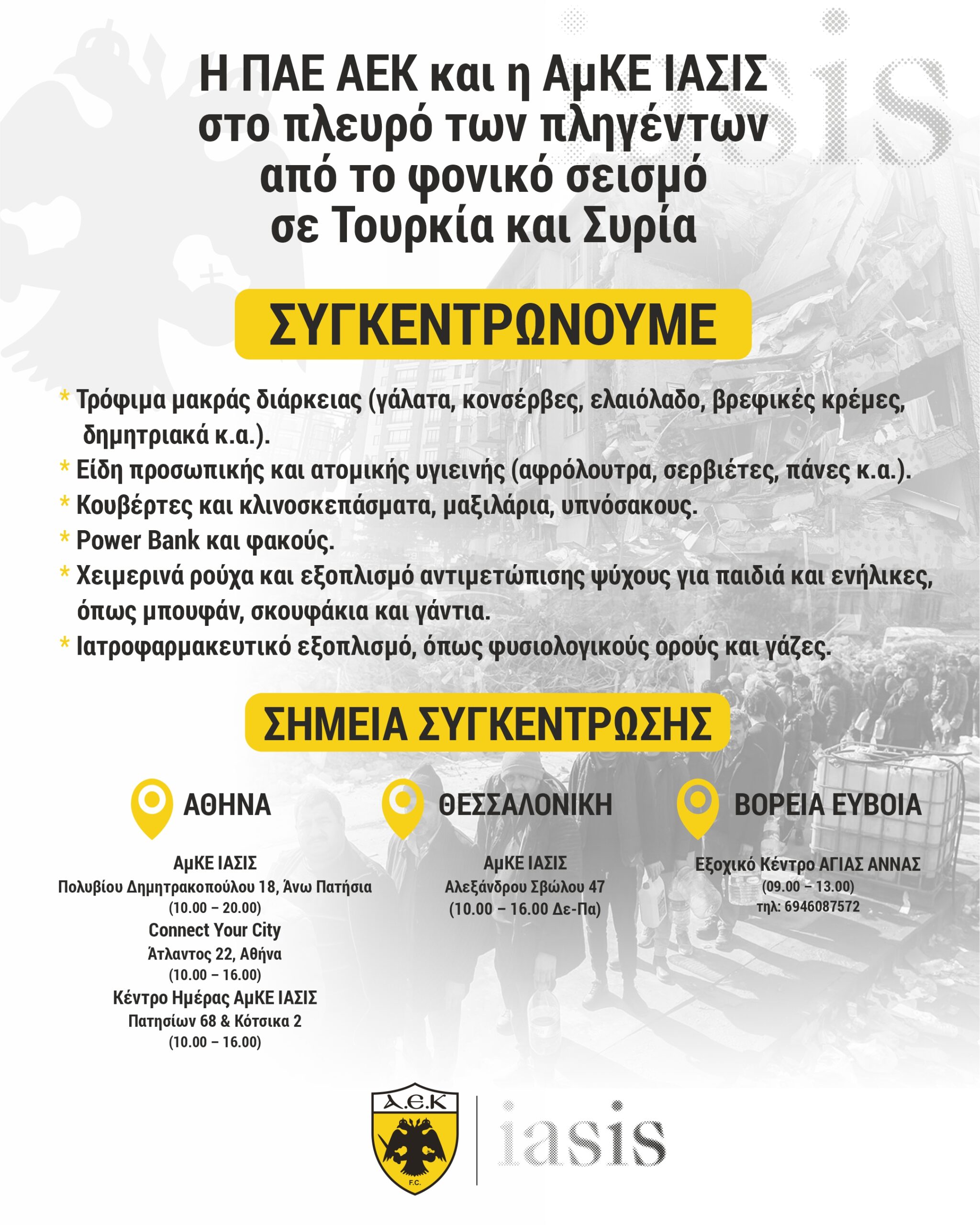 Η ΠΑΕ ΑΕΚ και η ΙΑΣΙΣ στέκονται από κοινού στο πλευρό των πληγέντων από τον φονικό σεισμό σε Τουρκία και Συρία. Η ομάδα μας και η Αστική Μη Κερδοσκοπική Εταιρεία ΙΑΣΙΣ επιχειρούν να απαλύνουν τον πόνο των συνανθρώπων μας που μας χρειάζονται σε αυτές τις πολύ δύσκολες στιγμές και ζητούν και τη δική σας βοήθεια, για την κάλυψη των άμεσων αναγκών τους.