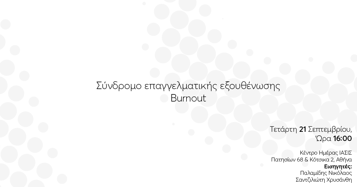 Με μεγάλη μας χαρά σας προσκαλούμε στην δια ζώσης ψυχοεκπαιδευτική συνάντηση βιωματικού χαρακτήρα με θέμα: "ΣΥΝΔΡΟΜΟ ΕΠΑΓΓΕΛΜΑΤΙΚΗΣ ΕΞΟΥΘΕΝΩΣΗΣ - BURNOUT", που θα πραγματοποιηθεί την Τετάρτη 21/9/2022 και ώρα 16:00μμ, στο Κέντρο Ημέρας ΙΑΣΙΣ (Πατησίων 68 και Κότσικα 2). . Ελάτε να γνωρίσετε την ψυχική υγεία από κοντά και να συζητήσουμε για την στρεσσογόνο